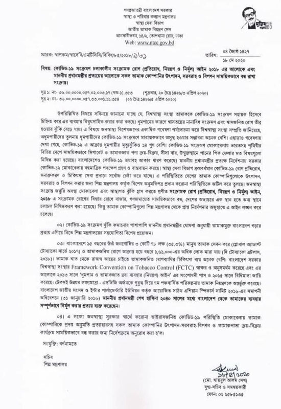 চিঠিতে আরও বলা হয়, প্রধানমন্ত্রীর প্রত্যক্ষ নির্দেশনায় সরকার কোভিড-১৯ মোকাবিলায় বহুমাত্রিক পদক্ষেপ গ্রহণ ও বাস্তবায়ন করছে। স্বাস্থ্যসেবা বিভাগ ক্রমবর্ধমান কোডিড-১৯ রোগ প্রতিরোধে, শনাক্তকরণ ও চিকিৎসাসেবা প্রদানে সর্বোচ্চ চেষ্টা করে যাচ্ছে। এ পরিস্থিতিতে দেশের তামাক কোম্পানিগুলোকে উৎপাদন, সরবরাহ ও বিপণন করার জন্য শিল্প মন্ত্রণালয় কর্তৃক বিশেষ অনুমতিপত্র প্রদান করা পরিস্থিতিকে জটিল করে তুলছে। জনস্বাস্থ্য সংক্রান্ত জরুরি অবস্থা মোকাবিলা এবং স্বাস্থ্যগত ঝুঁকি হ্রাস করতে প্রণীত সংক্রামক রোগ (প্রতিরোধ, নিয়ন্ত্রণ ও নির্মূল) আইন, ২০১৮-এ সংক্রামক রোগের বিস্তার রোধে বাজার, গণজমায়েত সাময়িকভাবে বন্ধ, দেশের অভ্যন্তরে এক স্থান থেকে অনা স্থানে চলাচল নিষিদ্ধ করা হয়েছে। কিন্তু তামাক কোম্পানিগুলো শিল্প মন্ত্রণালয় থেকে প্রাপ্ত নির্দেশনার অজুহাতে এ আইন লঙ্ঘন করে চলেছে।