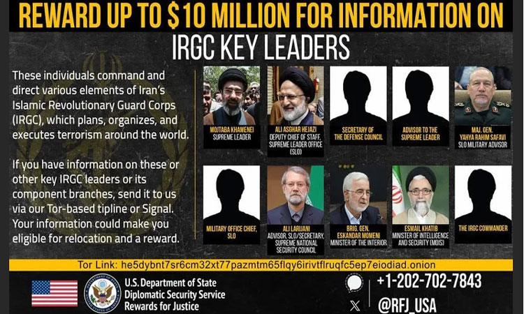 এতে বলা হয়, এই নেতাদের বা আইআরজিসির অন্য গুরুত্বপূর্ণ নেতাদের বিষয়ে তথ্য দিলে তথ্যদানকারী পুনর্বাসনের সুযোগ পাবেন এবং আর্থিক পুরস্কারও পেতে পারেন।