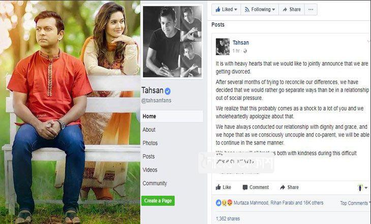তাহসান তার ভেরিফাইড ফেসবুক পেজ থেকে জনপ্রিয় এ সঙ্গীত তারকা ও তার স্ত্রী মিথিলা যৌথভাবে বলেন, বেশ কয়েকমাস ধরে নিজেদের মধ্যকার দ্বন্দ্ব বা মতবিরোধ নিরসনের চেষ্টার পর আমরা সিদ্ধান্ত নিয়েছি, সামাজিক চাপে একটা সম্পর্ক ধরে রাখার চেয়ে আমাদের আলাদা হয়ে যাওয়াই মঙ্গলজনক।