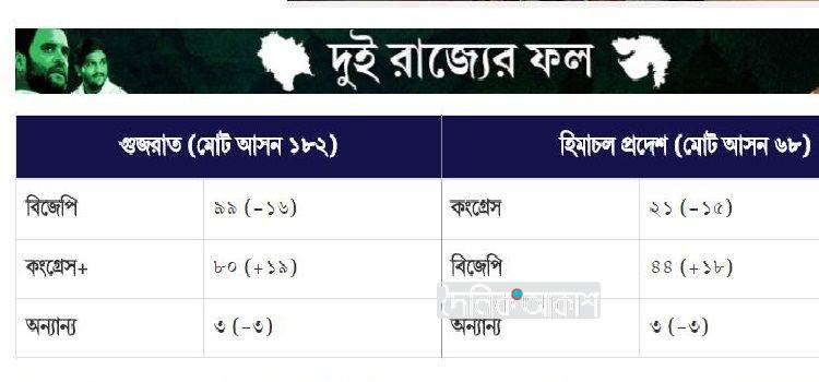 টানা ষষ্ঠবারের মতো গুজরাট বিধানসভা নির্বাচনে জয়লাভ করেছে ক্ষমতাসীন দল ভারতীয় জনতা পার্টি (বিজেপি)। একই সঙ্গে উত্তর ভারতের পাহাড়ি রাজ্য হিমাচল প্রদেশেও জয়লাভ করেছে বিজেপি। সোমবার সকাল থেকে এই দুই রাজ্যের ফল গণনা শুরু হয়।