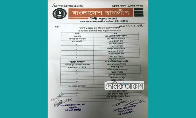 গাজীপুরের টঙ্গীতে ছাত্রদলের সক্রিয় কর্মী, হত্যাসহ একাধিক মামলার আসামি ও বিবাহিতদের দিয়ে ছাত্রলীগের কমিটি ঘোষণার তথ্য পাওয়া গেছে। এ নিয়ে ফেসবুকসহ নানাভাবে সমালোচনা করছেন ছাত্রলীগেরই একাংশের নেতাকর্মীরা। তারা ঘোষিত কমিটি বাতিলের দাবি জানাচ্ছেন। পদবঞ্চিত নেতাকর্মীদের তোলা নানা অভিযোগ খতিয়ে দেখতে তিন সদস্যের কমিটি ঘোষণার কথা জানিয়েছেন গাজীপুর ছাত্রলীগের একজন নেতা।