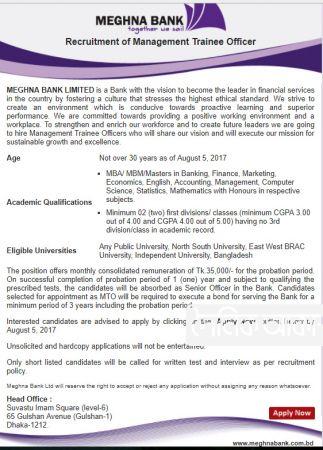 বেসরকারি ব্যাংকিং সেবাদানকারী প্রতিষ্ঠান মেঘনা ব্যাংক লিমিটেড নিয়োগের বিজ্ঞপ্তি প্রকাশ করেছে। ব্যাংকটিতে ‘ম্যানেজমেন্ট ট্রেইনি অফিসার’ পদে নিয়োগ দেওয়া হবে। নিয়োগপ্রাপ্তদের এক বছর পর প্রবেশনকাল শেষে সিনিয়র অফিসার পদে নিয়োগ করা হবে।