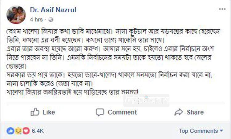 এর মধ্যে মঙ্গলবার সকালে আসিফ নজরুল ফেসবুকে লেখেন, ‘আমার মনে হয়, চাইলেও এবার নির্বাচনে অংশ নিতে পারবেন না তিনি (খালেদা)। এমনকি নির্বাচনের সময়টা তাকে হয়তো থাকতে হবে জেলের ভেতরে।’