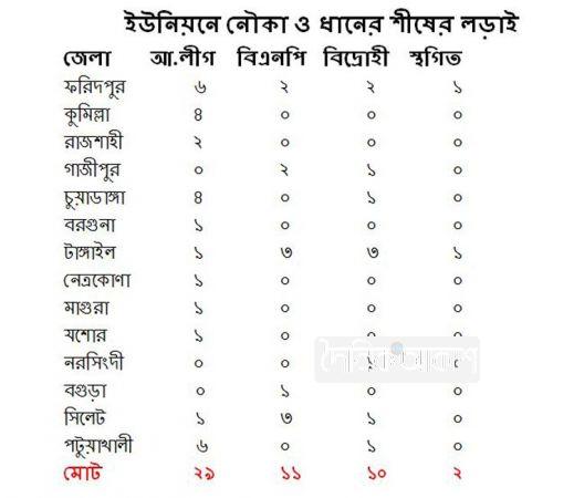 বৃহস্পতিবার স্থানীয় সরকারের যেসব এলাকায় নৌকা ও ধানের শীষে লড়াই হয়েছে তাতে বড় ব্যবধানে জয় হয়েছে ক্ষমতাসীন দলের প্রার্থীদের। যে ৫১টি ইউনিয়নে সাধারণ এবং উপনির্বাচনে ভোট হয়েছে, সেগুলোর চেয়ারম্যান পদের ২৮টিতেই জিতেছে আওয়ামী লীগের নৌকা। বিএনপির ধানের শীষ জিতেছে ১১টিতে।