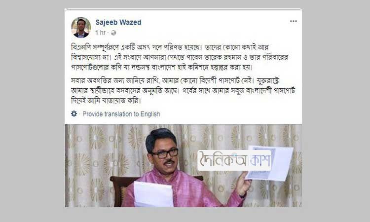 বিএনপি নেতা তারেক রহমানের বাংলাদেশের পাসপোর্ট জমা দেয়ার খবর প্রকাশের পর বিএনপির পক্ষ থেকে আসা বক্তব্যের জেরে প্রধানমন্ত্রীর ছেলে সজীব ওয়াজেদ জয় বলেছেন, তিনি বাংলাদেশ ছাড়া অন্য কোনো দেশের নাগরিকত্ব নেননি। সোমবার জয় তার ফেসবুক পেজে এ কথা জানান।