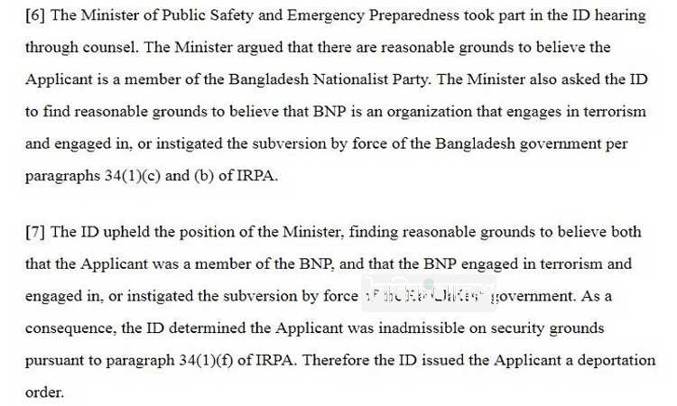 তার বিষয়ে কানাডা সরকার তখন আদালতকে বলে- তিনি বাংলাদেশের যে রাজনৈতিক দলের সদস্য পরিচয়ে আশ্রয়ের আবেদন করেছেন, সেই রাজনৈতিক দল সন্ত্রাসী কর্মকাণ্ডে যুক্ত।