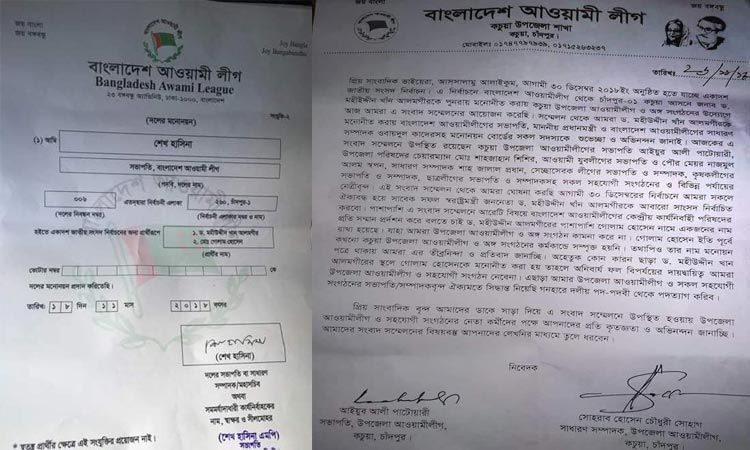 অপর মনোনয়ন প্রাপ্ত প্রার্থি মোঃ গোলাম হোসেনকে তারা আওয়ামী সংগঠনে নয় বলে দাবি করেন। মনোনয়ন পত্রে মোঃ গোলাম হোসেনের নাম থাকাতে নিন্দা ও প্রতিবাদ জানান। উল্লেখ্য চাঁদপুর-১ (কচুয়া) আসনের আওয়ামী লীগের দুই জনকে মনোনয়ন দিয়েছেন। প্রার্থিতা চুড়ান্ত না হওয়ায় সর্বমোট ১০ আসনে দৈত মনোনয়ন দিয়েছে আওয়ামী লীগ।