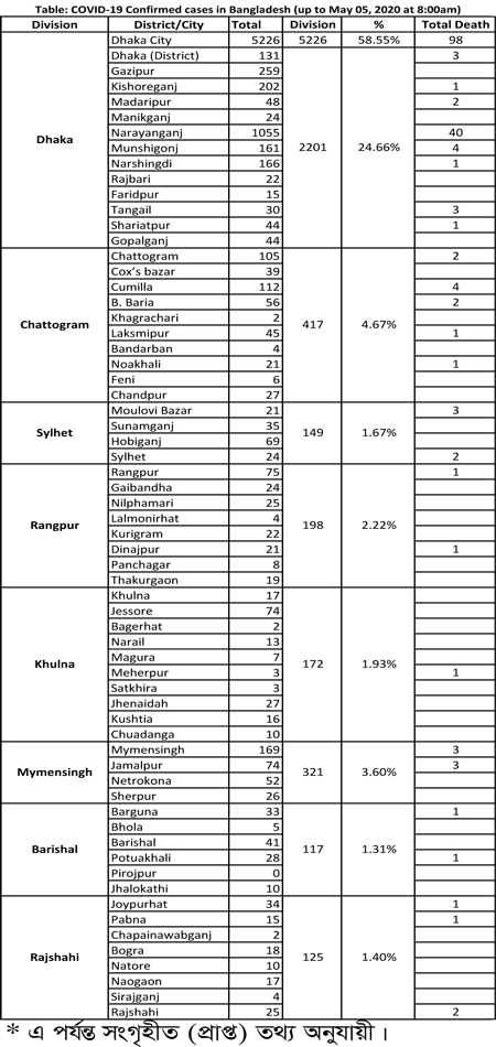 দেশে করোনা ভাইরাস মোকাবেলায় বিভিন্ন পদক্ষেপ নিয়েছে সরকার। করোনা পরিস্থিতি নিয়ন্ত্রণে রাখতে মাঠে কাজ করছে আইন-শৃঙ্খলা বাহিনী। বিশ্ব স্বাস্থ্য সংস্থার দিকনির্দেশনা অনুযায়ী করোনার প্রভাব বিস্তার ঠেকাতে অফিস-আদালত, স্কুল-কলেজ, হাট-বাজার সকল প্রকার সমাগত বন্ধ করে দিয়েছে সরকার। তারপরেও করোনা আক্রান্তের সংখ্যা দিন দিন বেড়েই চলেছে। দেশে গত ২৪ ঘণ্টায় করোনা ভাইরাসে আক্রান্ত হয়েছেন ৬৮৮ জন। আর সারাদেশে এই রোগীর সংখ্যা ১০৯২৯ জন। করোনা ভাইরাসে আক্রান্ত হয়ে মারা গেছেন ১ জন। এ নিয়ে করোনায় আক্রান্ত হয়ে মোট মারা গেছেন ১৮৩ জন। এছাড়া গত ২৪ ঘণ্টায় সুস্থ হয়ে বাড়ি ফিরে গেছেন ১৪৭ জন। এ নিয়ে এ পর্যন্ত সারা দেশে মোট সুস্থ হয়েছেন ১৪০২ জন। আজ মঙ্গলবার (৫ মে) নিয়মিত অনলাইন ব্রিফিংয়ে এসব তথ্য জানান স্বাস্থ্য অধিদপ্তরের অতিরিক্ত মহাপরিচালক (প্রশাসন) অধ্যাপক ডা. নাসিমা সুলতানা।