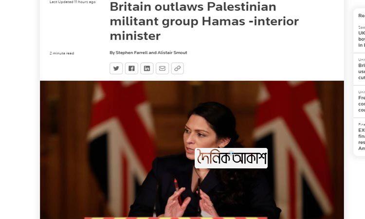 আকাশ আর্ন্তজাতিক ডেস্ক: ফিলিস্তিনি সশস্ত্র গ্রুপ হামাসকে সন্ত্রাসী সংগঠন আখ্যা দিয়ে নিষিদ্ধ করার প্রক্রিয়া শুরু করেছে ব্রিটেন। শুক্রবার (১৯ নভেম্বর)