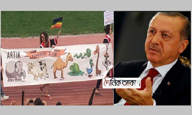 অাকাশ আর্ন্তজাতিক ডেস্ক: তুরস্কের প্রেসিডেন্ট রিসেপ তাইয়্যিপ এরদোগানকে ব্যঙ্গ করে হাতি, উট, ব্যাঙ ও অন্যান্য পশুদের প্রতিকৃতি এঁকে ব্যানার প্রদর্শন