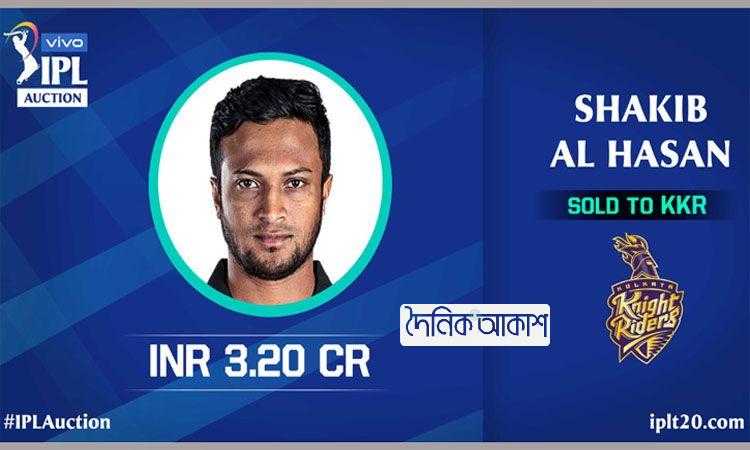 আকাশ স্পোর্টস ডেস্ক: আইপিএলের নিলামে সাকিব আল হাসানকে ৩ কোটি ২০ লাখ রুপিতে (বাংলাদেশি মুদ্রায় প্রায় ৩ কোটি ৭৪ লাখ