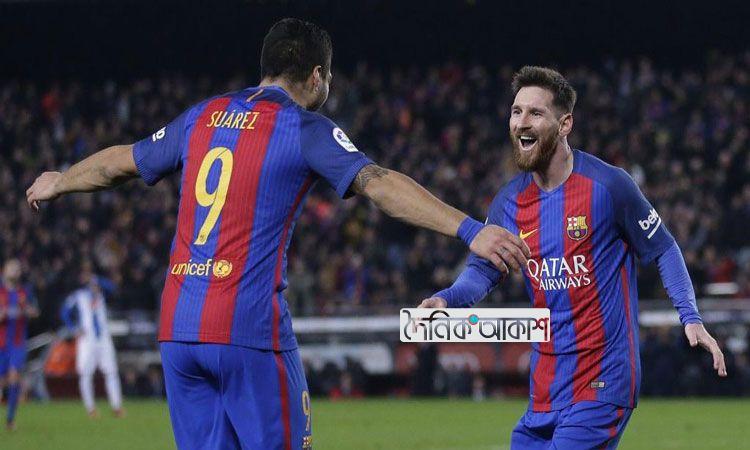 সুয়ারেজের হ্যাটট্রিক ও মেসির জোড়া গোলে বার্সার বড় জয়