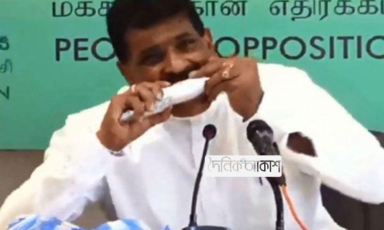 আকাশ নিউজ ডেস্ক: সংবাদ সম্মেলনে কাঁচা মাছেই কামড় বসালেন সাবেক মন্ত্রী! আবার তা চিবিয়ে খাইয়ে দেখালেনও! তিনি শ্রীলঙ্কার সাবেক মৎস্য