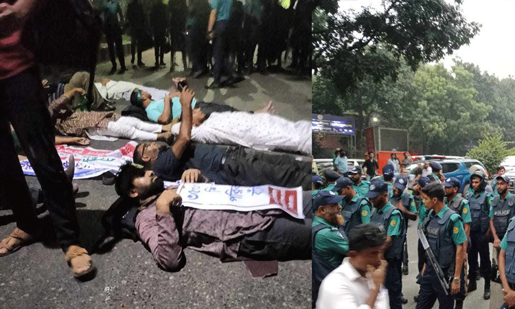 রাস্তায় শুয়ে বিক্ষোভ বেসরকারি শিক্ষকদের