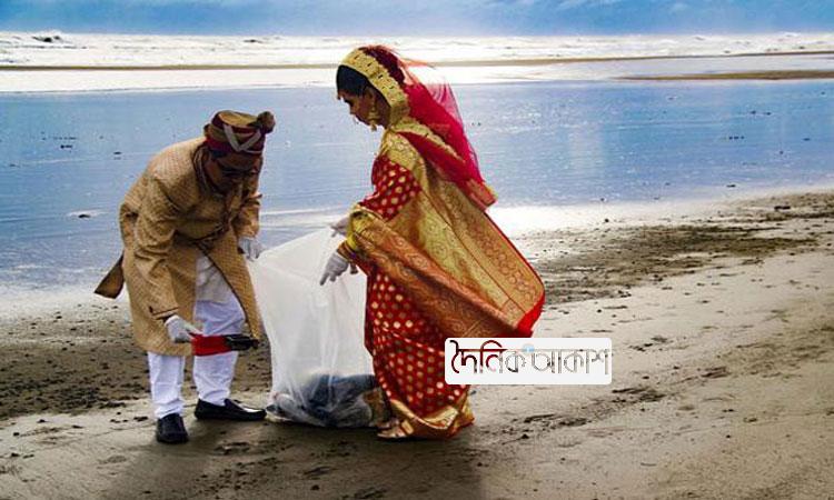 আকাশ জাতীয় ডেস্ক: কক্সবাজার সমুদ্র সৈকতে এক নবদম্পতি হানিমুনে গিয়ে সৈকতের আবর্জনা পরিষ্কারে নেমেছেন। কাজটি করলেন বিয়ের পোশাকে, যাতে করে