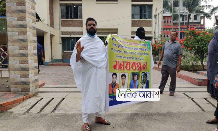 কাফনের কাপড় পড়ে ছাত্রলীগ নেতার বিরুদ্ধে দম্পতির প্রতিবাদ