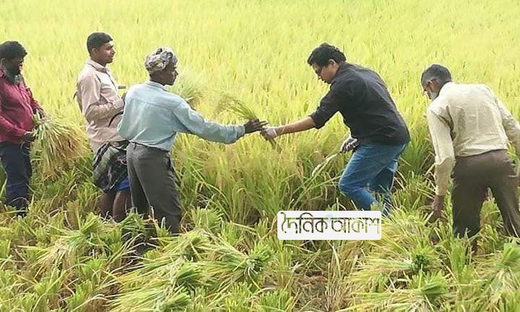 আকাশ জাতীয় ডেস্ক: নাটোরের সিংড়া উপজেলার চলনবিল অধ্যুষিত রামানন্দ খাজুরা ইউনিয়নের বাঁশের ব্রিজ সংলগ্ন কৈগ্রাম এলাকায় কৃষকের ধান কেটে দিলেন