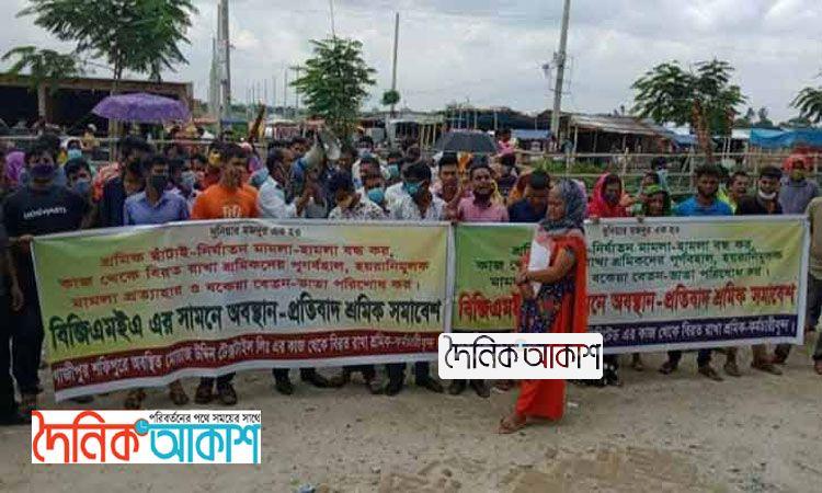 বিজিএমইএর সামনে শ্রমিকদের অবস্থান ধর্মঘট