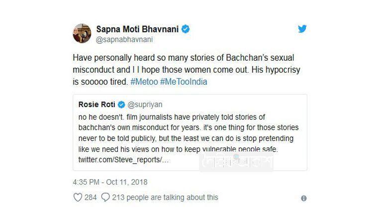 আকাশ বিনোদন ডেস্ক: এবার #মিটু-ঝড়ের কবলে পড়লেন বিগবি অমিতাভ বচ্চন। বলিউড শাহেনশাহকে তীব্র ভাষায় আক্রমণ করেছেন স্বপ্না মতি ভাবনানি নামের