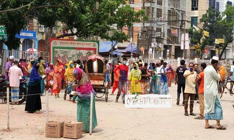 ত্রাণের আশায় খিলগাঁও থানার সামনে হাজারো মানুষ