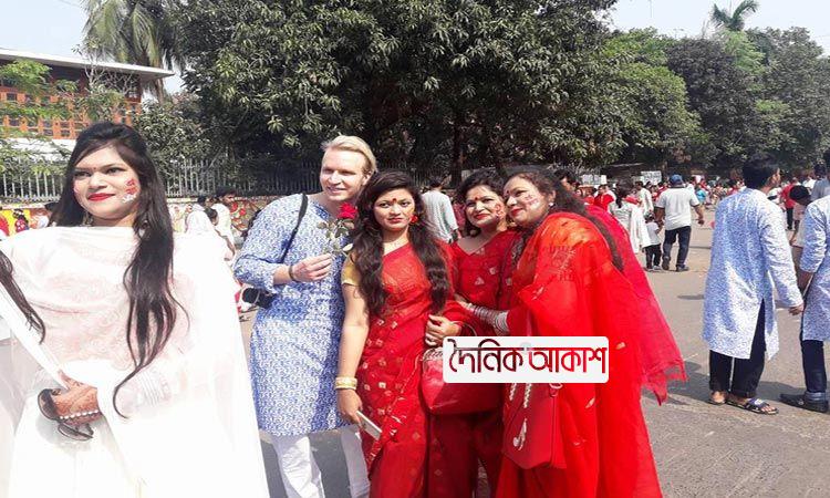 অাকাশ জাতীয় ডেস্ক: নববর্ষের উৎসবে আনন্দ ভাগাভাগিতে বাঙালিদের পাশাপাশি মেতে উঠেছেন অনেক বিদেশিও। বাঙালির প্রাণের এই উৎসবে মিলেমিশে একাকার হয়েছেন