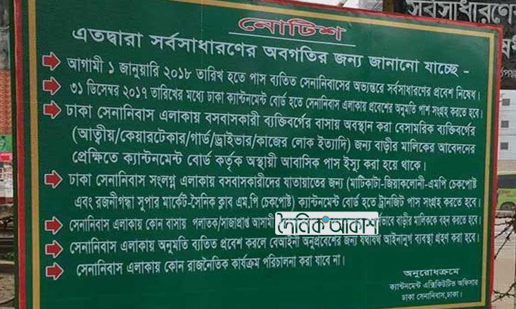 ঢাকা সেনানিবাসে ট্রানজিট পাস ছাড়া যাতায়াতে নিষেধাজ্ঞা