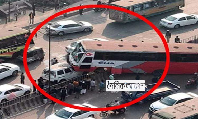 আকাশ জাতীয় ডেস্ক: ঢাকার খিলক্ষেতে নিয়ন্ত্রণ হারিয়ে আইল্যান্ড ভেঙে পাশের লেনের চলন্ত মাইক্রোবাসের ওপর উঠে গেছে এনা পরিবহনের একটি বাস।