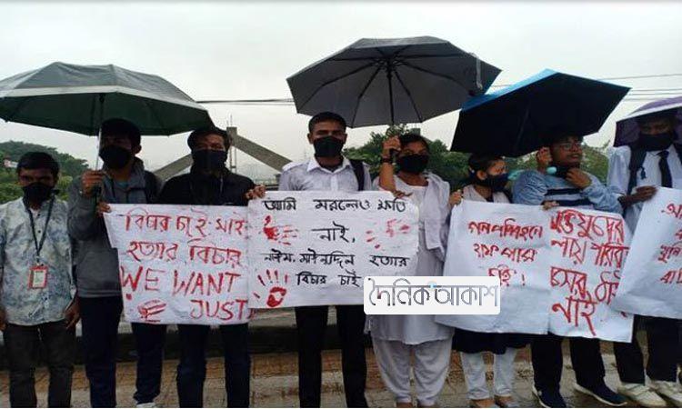 বৃষ্টি উপেক্ষা করে রামপুরার সড়কে শিক্ষার্থীরা