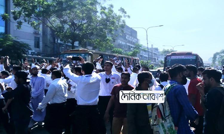 হাফ ভাড়া কার্যকরের দাবিতে ঢাকা কলেজের সামনে শিক্ষার্থীদের বিক্ষোভ