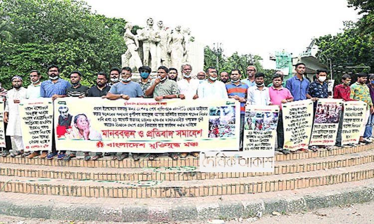 মাহফুজ আনাম মতিউর রহমানের গ্রেফতার ও বিচার দাবিতে মুক্তিযুদ্ধ মঞ্চের মানববন্ধন