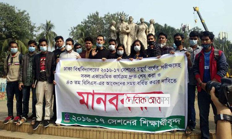 আকাশ জাতীয় ডেস্ক: অনার্স ফাইনাল পরীক্ষা গ্রহণ ও ৪৩তম বিসিএস পরীক্ষায় আবেদনের সময় বাড়ানোর দাবিতে মানববন্ধন করেছেন ঢাকা বিশ্ববিদ্যালয়ের (ঢাবি)