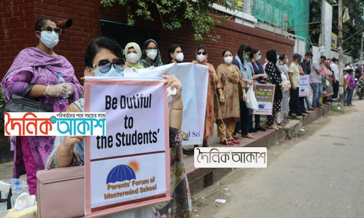 আকাশ জাতীয় ডেস্ক: করোনা ভাইরাস পরিস্থিতিতে ৫০ শতাংশ টিউশন ফি প্রদান এবং অনলাইনে মানসম্মত ক্লাস নিশ্চিত করার দাবিতে মানববন্ধন করেছে