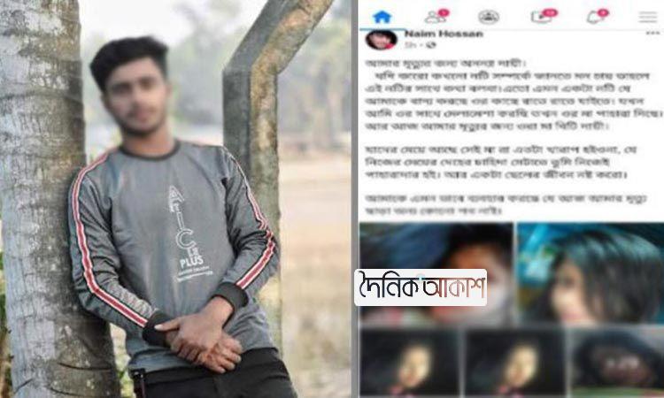 আকাশ জাতীয় ডেস্ক: ‘আমার মৃত্যুর জন্য অনন্যা দায়ী’ এমন শিরোনামে প্রেমিকার ছবিসহ ফেসবুকে একটি স্ট্যাটাস দিয়ে নাঈম হোসেন (২২) নামে