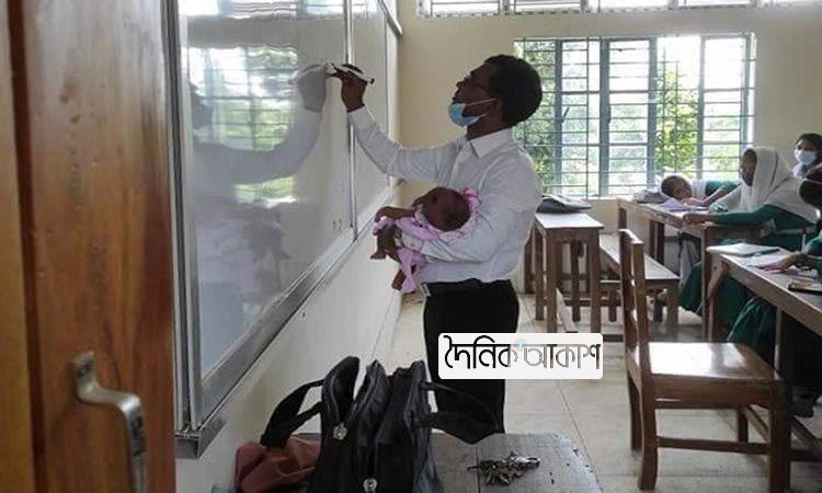 শিক্ষার্থীর সন্তানকে কোলে নিয়ে শিক্ষকের পাঠদান, ফেসবুকে ভাইরাল