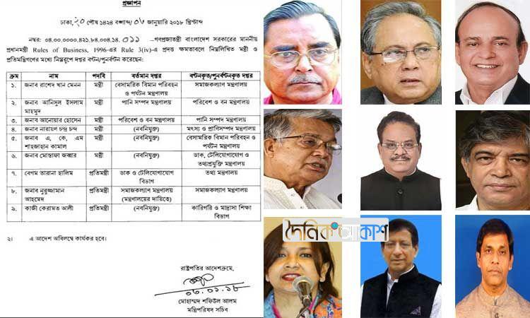 অাকাশ জাতীয় ডেস্ক: মন্ত্রিসভায় নতুন সদস্য হিসেবে যোগ দেয়া তিন জন এবং পদোন্নতি পাওয়া একজনের মধ্যে দায়িত্ব বণ্টন করা হয়েছে।